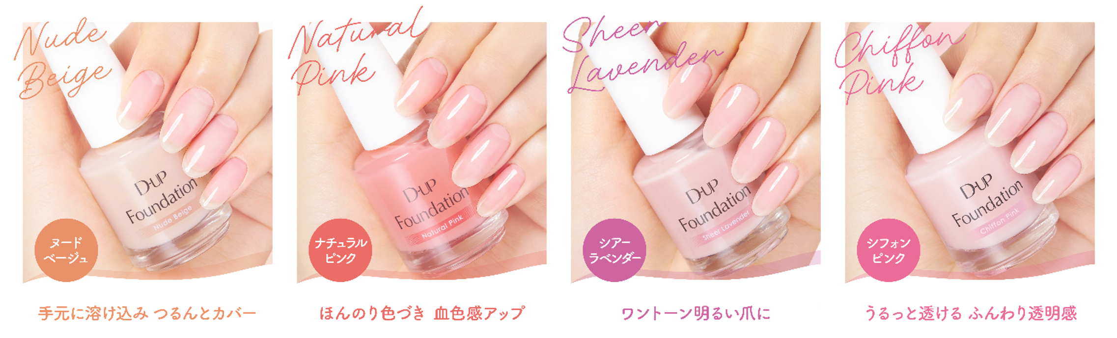 ふんわり色づく透け感カラーで、爪の凹凸や色ムラをつるんとカバー。まるで元から素爪がキレイな印象に。ナチュラルに指先を美しく見せたいすべての人へ、目的やお好みに合わせて選べる4色のラインナップです。