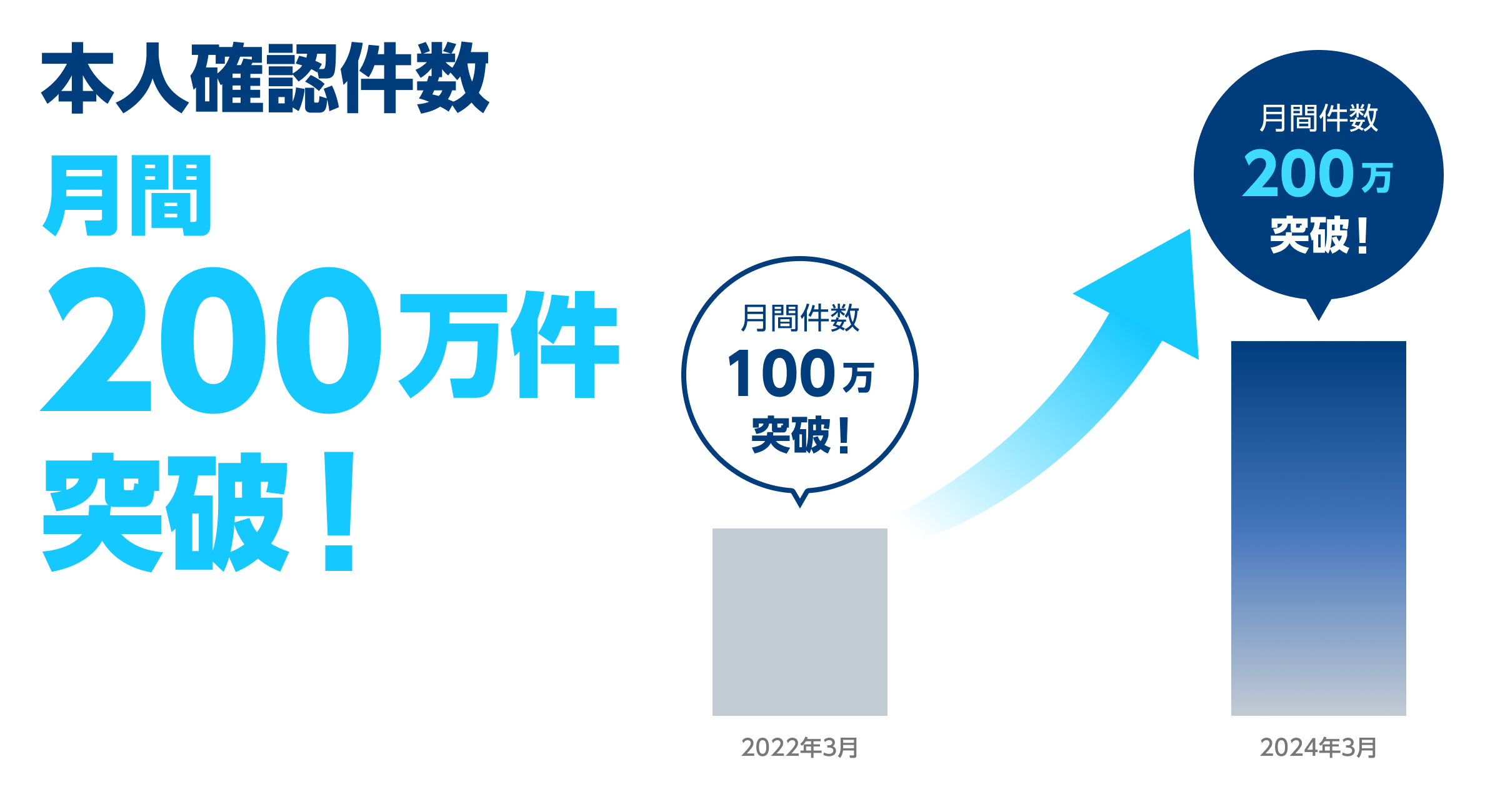 金融、通信キャリア、古物買い取り、シェアリングエコノミー関連、マッチングアプリ、暗号資産取引サービス、ブロックチェーンゲームのギルドサービスといったWeb3関連サービスなど多様な業界に導入され、契約事業者数は200社、累計本人確認件数は4,000万件を突破しています。導入社数と利用シーンが堅調に拡大していることに加え、特に暗号資産業界の口座開設における利用拡大が顕著で前月比約2倍となり、この度の月間本人確認件数200万件突破に至りました。