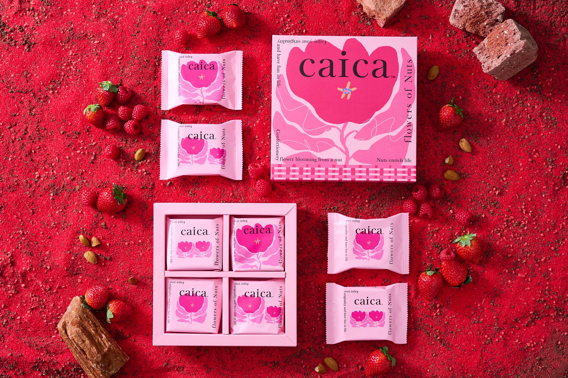 ナッツ菓子専門店「caica」は、ナッツの可能性を引き出した菓子を展開するブランドです。一般的にトッピングや食感のアクセントなどとして使われるシーンが多いナッツ。「caica」では、ナッツそれぞれが持つ「香り」「食感」「風味」といった個性に着目し、ナッツを軸にした“ナッツを楽しむお菓子”を展開いたします。商品を通してナッツの美味しさと、毎日のちょっとした時間に花咲くような幸せなひとときをお届けします。