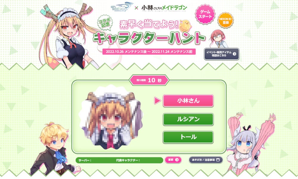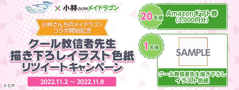 また、コラボ特設サイトでは、ゲーム内アイテムが手に入るWebイベント(ゲーム)がプレイできるほか、『小林さんちのメイドラゴン』オリジナルグッズや作者描き下ろしのイラスト色紙、Amazonギフトカード、NEXONポイントなどが当たるキャンペーンも開催いたします。