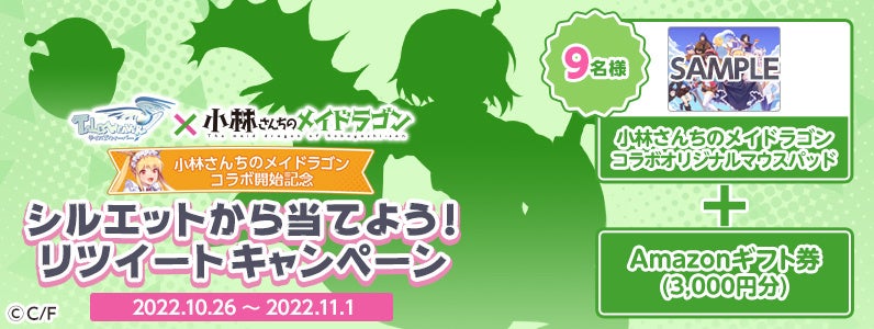 ・10月26日(水)に『テイルズウィーバー』の公式Twitterアカウントから投稿されるキャンペーン対象ツイートにシルエットで描かれた、『小林さんちのメイドラゴン』のキャラクター名を記載し、引用リツイートします。