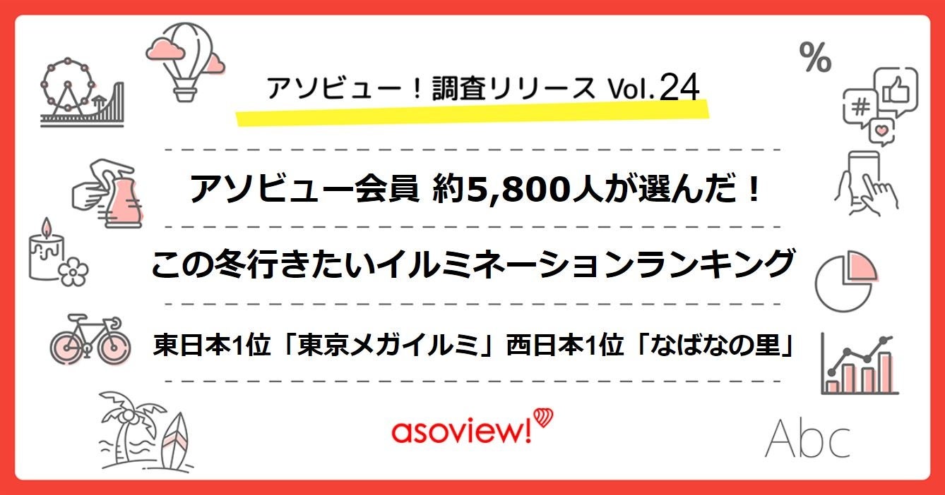休日の便利でお得な遊び予約サイト「アソビュー!」(URL:https://www.asoview.com/、以下:アソビュー!)を運営するアソビュー株式会社(所在地:東京都品川区、代表執行役員CEO:山野智久)は、本格化するシーズンを前にイルミネーションについてアソビュー!会員(n=5,807)にアンケート調査を行いました。その結果を「この冬行きたいイルミネーションランキング」として東日本・西日本、在住エリア別のランキング形式で発表いたします。