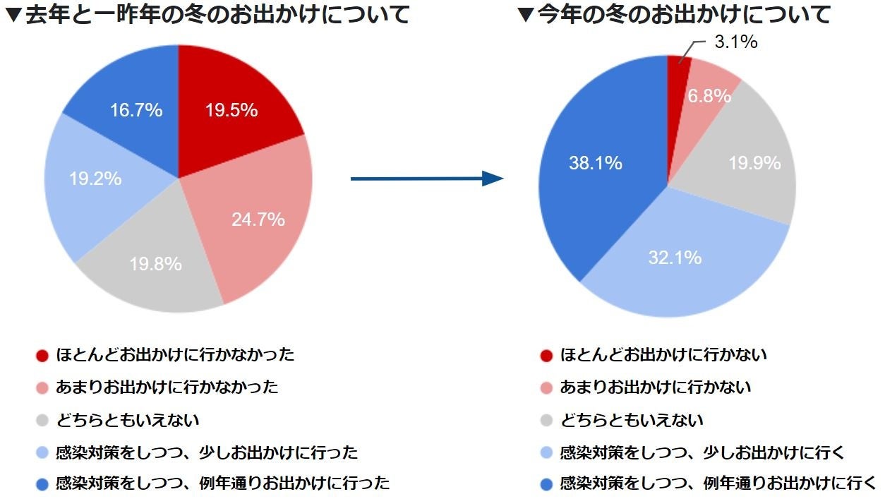 イルミネーションのシーズンが本格化する冬のお出かけについても合わせて調査したところ、去年と一昨年の2年間の冬のお出かけについては「ほとんどお出かけに行かなかった」「あまりお出かけに行かない」と回答した人が4割、「どちらともいえない」と回答した人が2割、「感染対策をしつつ、例年通りお出かけに行った」「感染対策をしつつ、少しお出かけに行った」と回答した人が3.5割と、お出かけのセーブ具合はまばらだったのに対し、今年の冬は「感染対策をしつつ、例年通りお出かけに行く」「感染対策をしつつ、少しお出かけに行く」と回答した人が7割に上りました。去年までの冬は、お出かけを自粛していた人も多かった一方、今年こそはお出かけをしたいと考えている人が多いことが分かります。