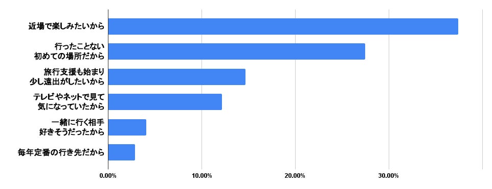 近場が人気となっている一方で、「旅行支援も始まり、少し遠出がしたいから」が14.65%と3番目に多くなっており、東日本エリア在住者が選ぶランキングの第7位以降に西日本の施設がランクインしたことからも、この冬は全国旅行支援等を利用して少し遠出したいと考えている人も一定いることが伺えます。