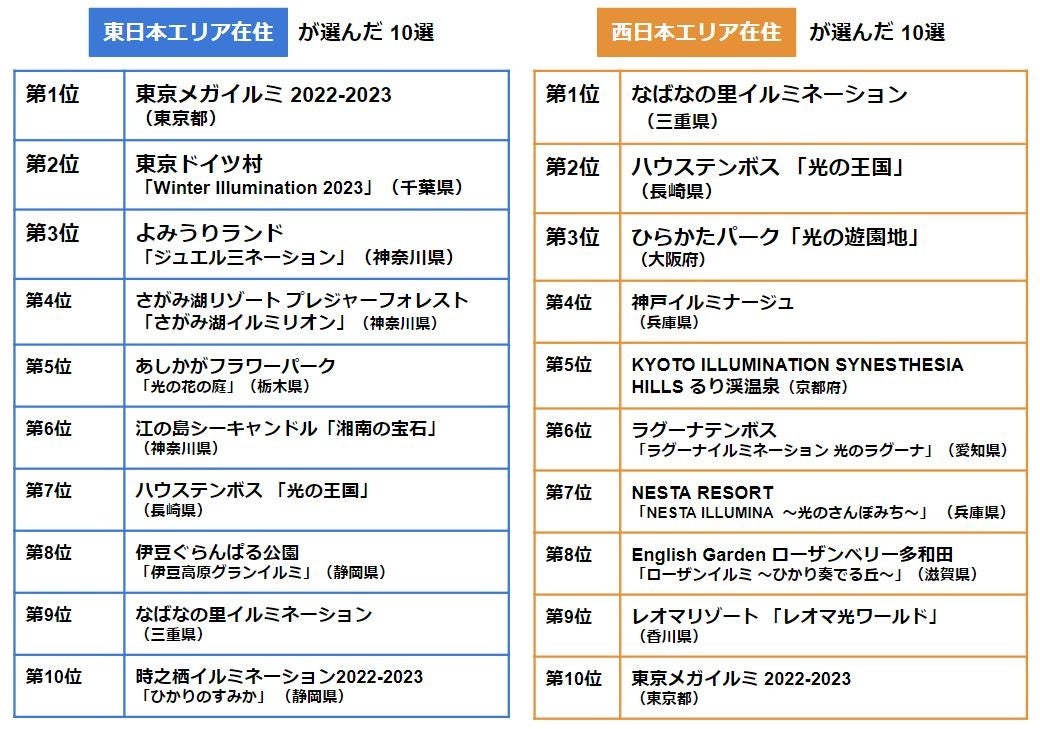 ※全国のイルミネーションスポットから3箇所を選択、東日本エリア在住と西日本エリア在住の会員に分けてデータを集計