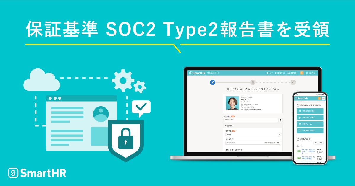 株式会社SmartHR(本社:東京都港区、代表取締役:芹澤 雅人、以下「当社」)は、提供するクラウド人事労務ソフト「SmartHR(スマートエイチアール)」に関するSOC2 Type2保証報告書を2022年3月31日に受領いたしました。
