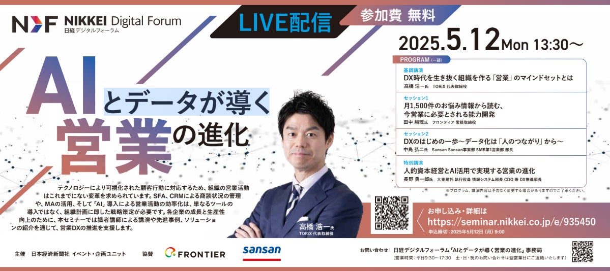 ビジネスマッチングサービス「Ready Crew(レディクル)」を運営するフロンティア株式会社(本社:東京都渋谷区、代表取締役社長:高橋 政裕、以下 当社)は、2025年5月12日(月)開催の「日経デジタルフォーラム - AIとデータが導く営業の進化」に登壇いたします。