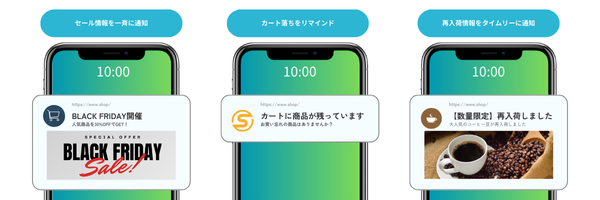 1.メルマガよりも高い開封率で能動的にアプローチが可能 2.カート落ち/カゴ落ち防止プッシュで売上向上 3.Cookie依存なしでターゲティングができ、ポストCookie対策(クッキーレス対応問題)にも! |