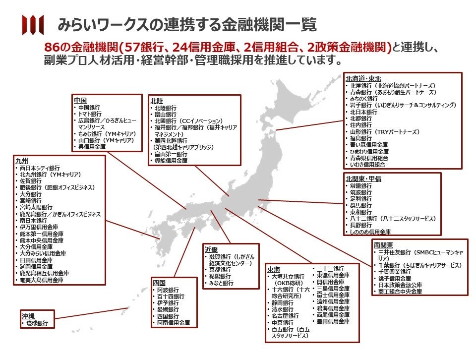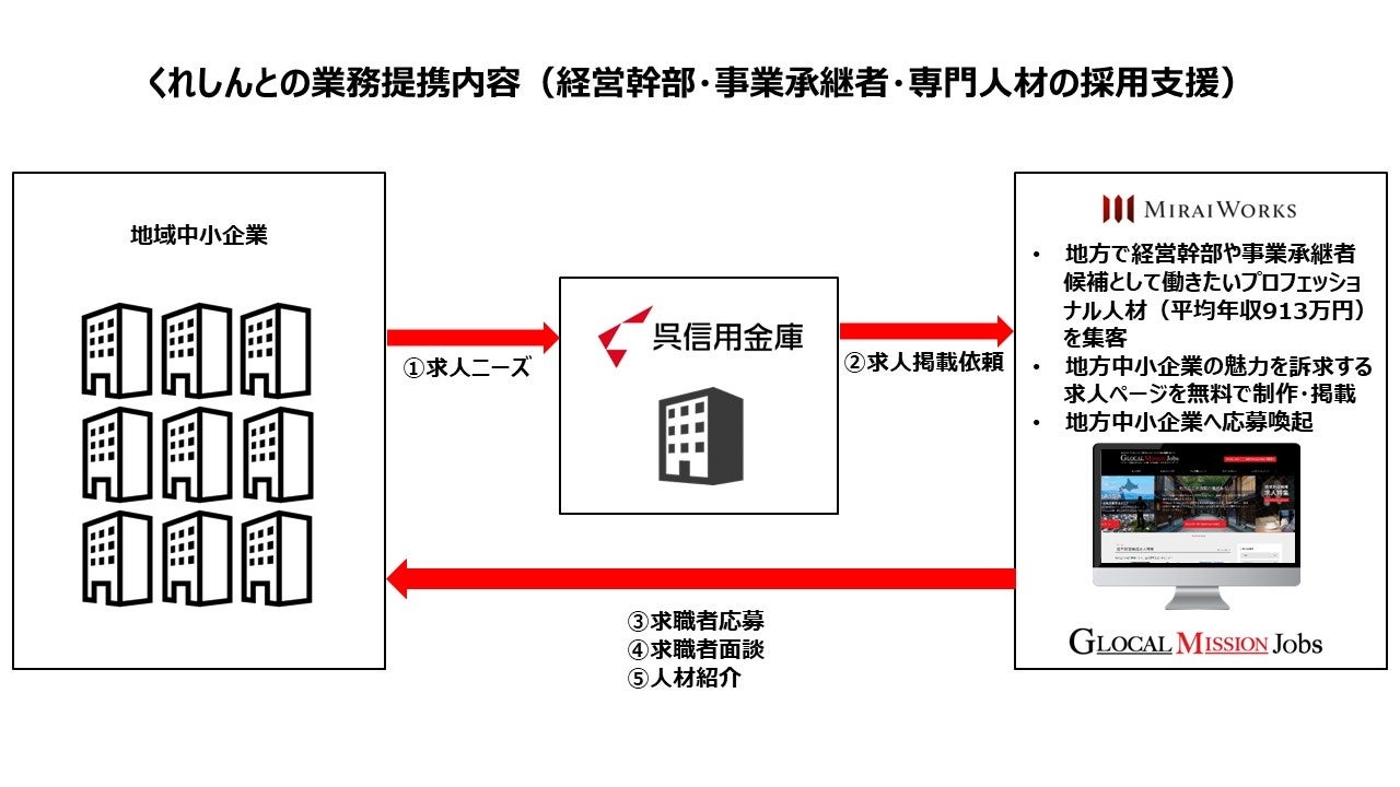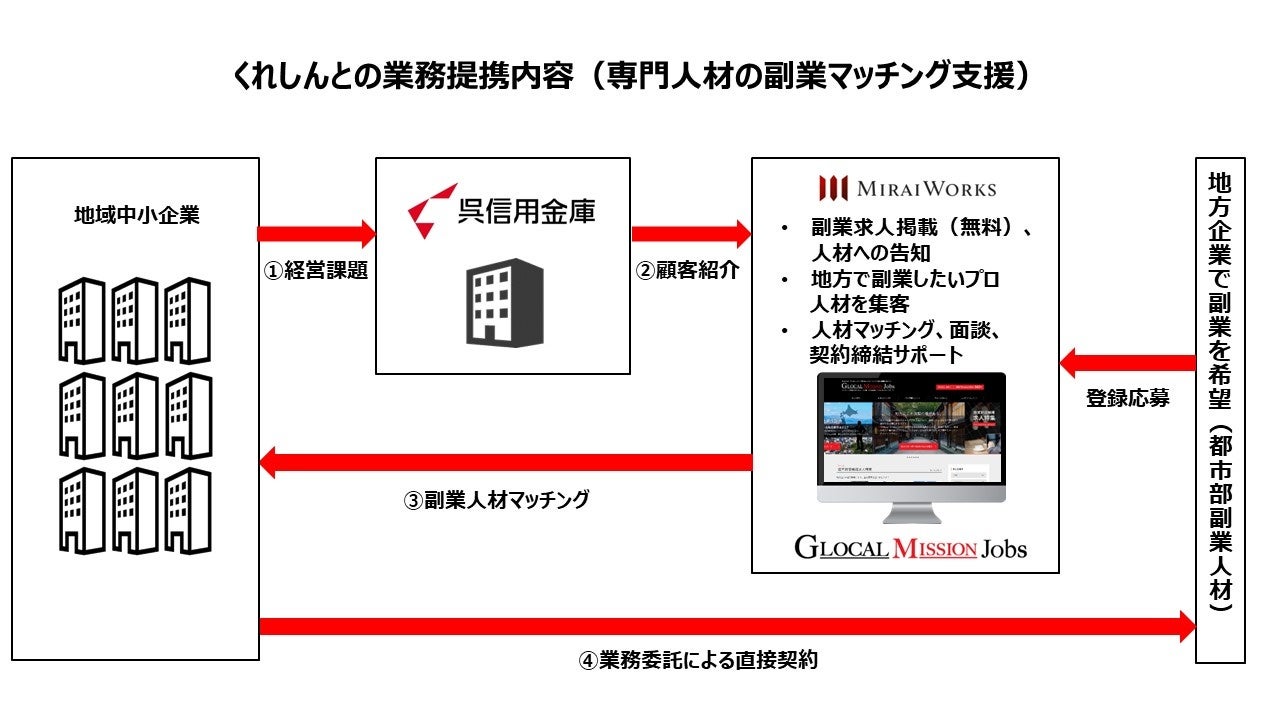 プロフェッショナル人材のフリーランス・副業といった多様な働き方をサポートする株式会社みらいワークス(本社:東京都港区、代表取締役社長:岡本祥治、証券コード:6563、以下「当社」)は、呉信用金庫(本店:広島県呉市、理事長:向井淳滋、以下「くれしん」)と人材支援による地域企業の事業強化を目的とした業務提携契約を締結したことをお知らせいたします。また、今回のくれしんとの提携をもって、86の地域金融機関と地方転職・副業人材の活用を推進することとなります。
