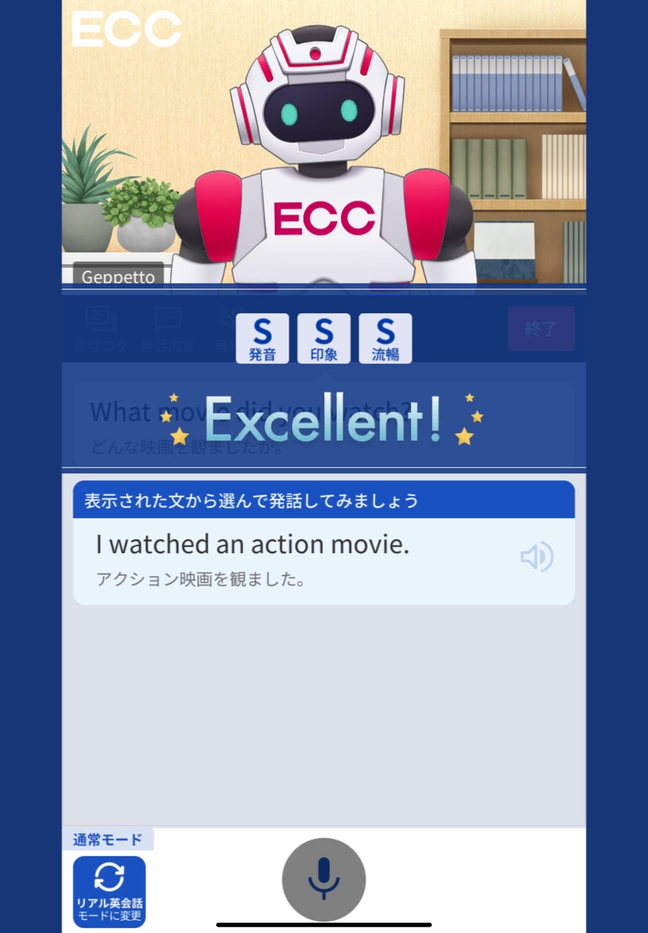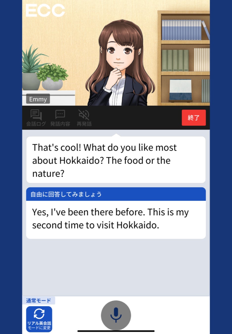 「ECC Study Assist」は、AIを相手に実践的な英会話練習をすることができるECCの学習支援アプリです。生成AIを活用した自由会話機能を搭載し、授業で学習したトピックなどについてAIと自由に会話を展開でき、生徒自身の自発的な発話を促進して会話練習を支援します。