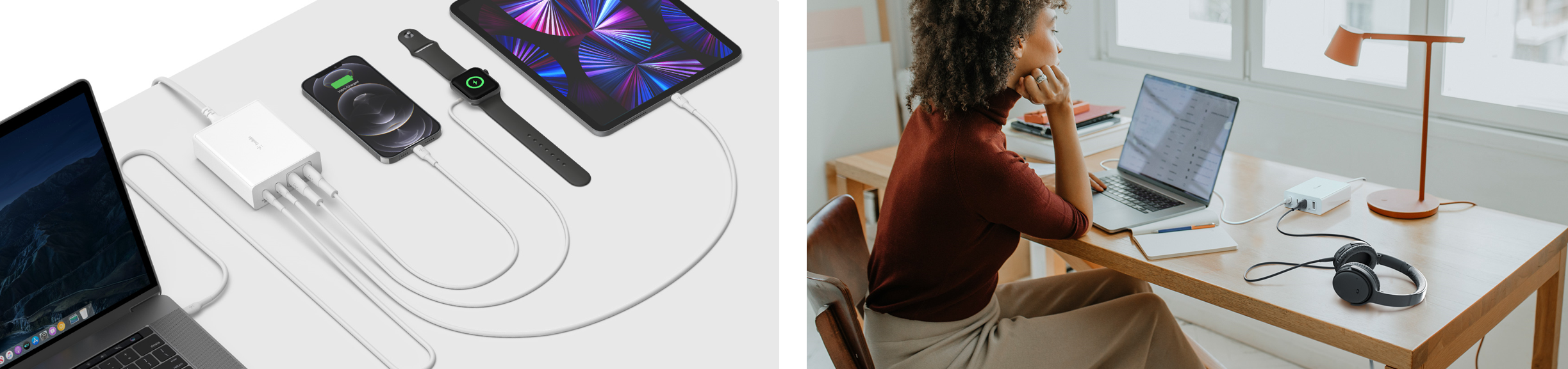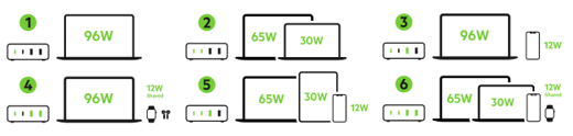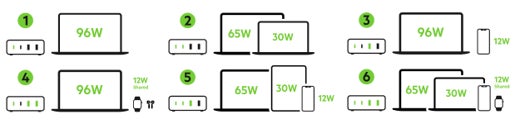 最大108Wの出力で、ノートPC1台とその他のデバイスを最大3台まで同時かつ効率的に充電できます。