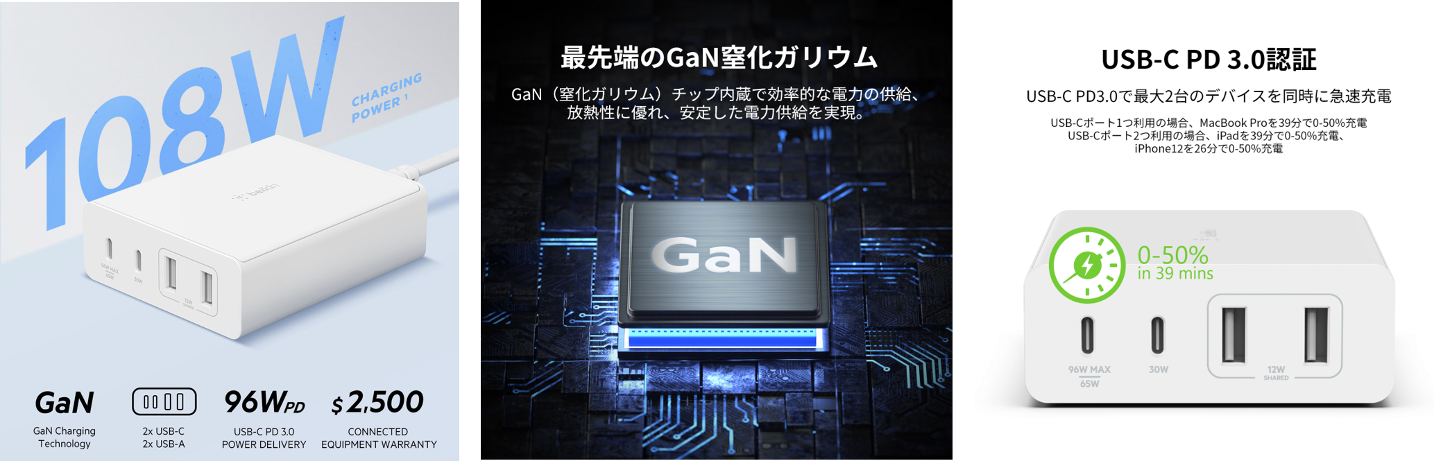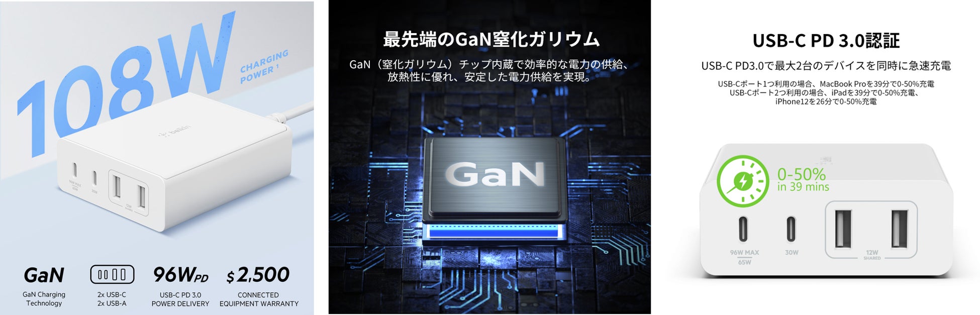 製品名:Belkin BOOST↑CHARGE PRO 4ポートGaN充電器108W