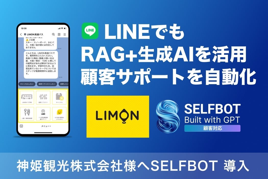 SELF株式会社(本社:東京都新宿区、代表取締役:生見 臣司、以下:SELF)は、ChatGPTと連携したAIチャットボット「SELFBOT」を神姫観光株式会社(本社:兵庫県姫路市、代表取締役:兵働 忠志、以下:神姫観光)の展開する”LIMON”のWebサイト、およびLINE公式アカウントに顧客対応の効率化を目的として導入いただきました。