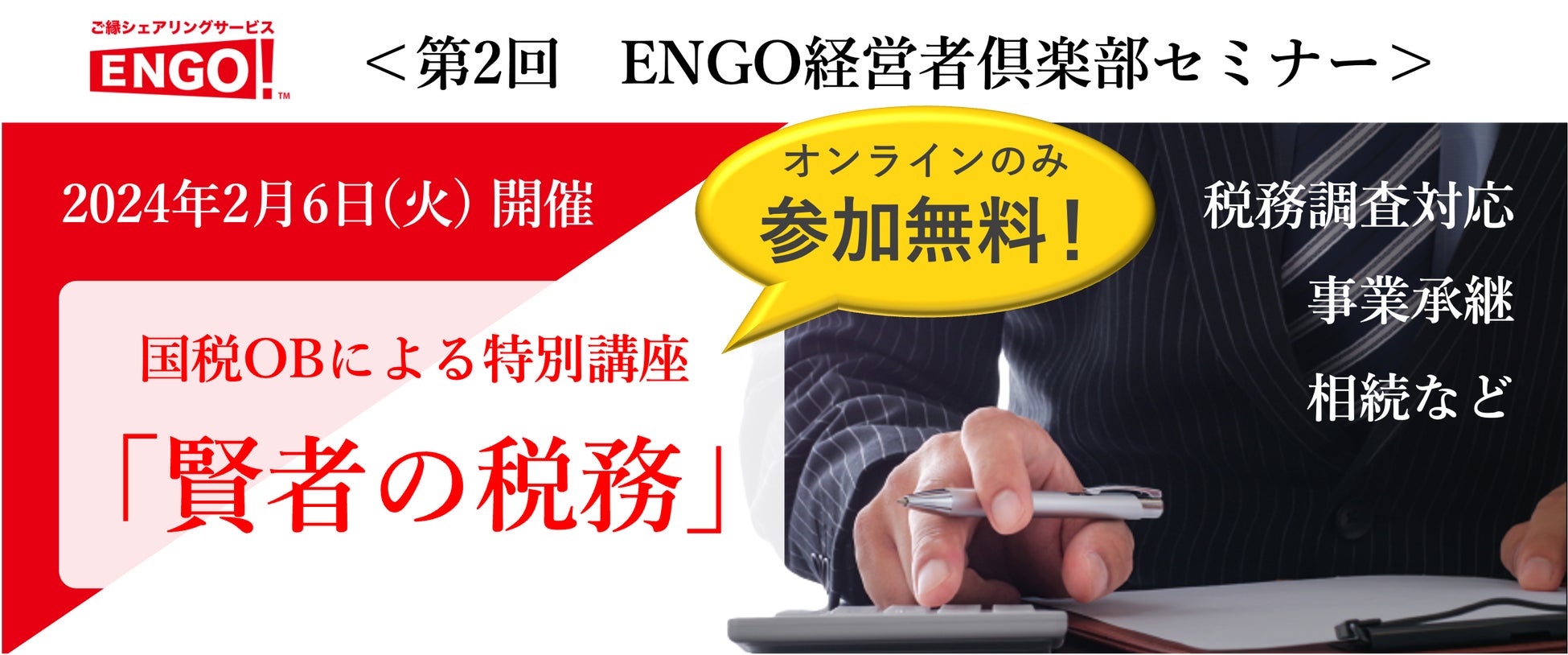 第2回目となるENGO経営者俱楽部セミナーでは、「決算直前でもできる中小企業の節税対策」を開催いたします。国税OBを講師にお迎えし、駆け込みの節税対策で税務署が必ず見ているポイントや税務署も認めざるを得ない決算直前の節税対策について、国税OBでなければ知り得ない内容をお話する予定となっております。