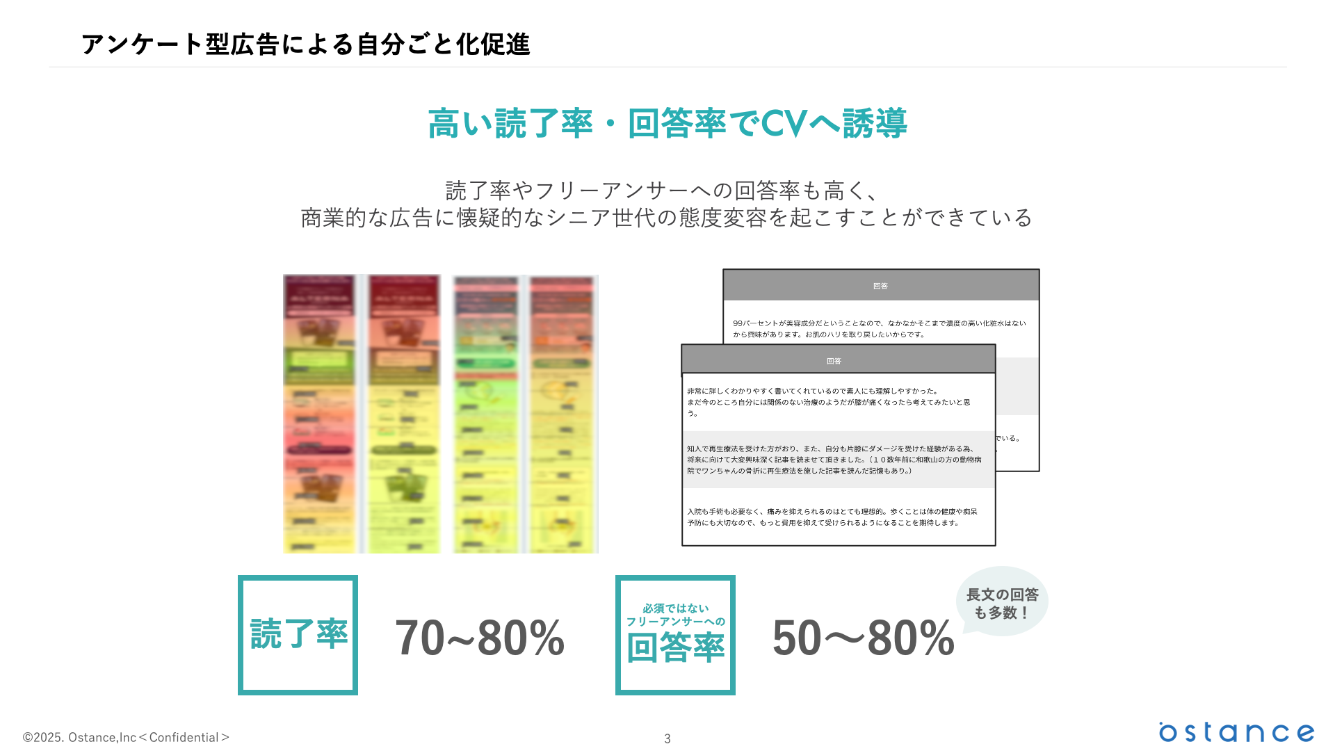 国内最大級のシニア向けSNS『趣味人倶楽部』(会員数42万人)を運営するオースタンスは、シニア世代向けの「疾患啓発PRメニュー」の提供を開始します。従来、製薬企業各社様から「広告は見られても、クリック以降の理解度や受診・相談意向を把握しづらい」「その後の行動(受診・相談・情報収集)につながりにくい」といった課題が寄せられていました。特にシニア世代の方は「自分はまだ大丈夫」と受け止めがちで、行動に移しにくい傾向があります。こうした実情を踏まえ、当社は『趣味人倶楽部』の独自データと医療系コンテンツを組み合わせ、体験談記事・医師監修コンテンツ・アンケート型広告・類似オーディエンス配信までを一気通貫で設計。会員42万人超のデータに、累計1,000名超のシニアインタビューと200社以上の支援で蓄積した知見を掛け合わせることで、クリック以降の態度変容や受診・相談意向を可視化し、「認知→理解→行動」までを継続的に伴走します。これにより、単発の認知施策にとどまらない、再現性の高い成果創出を実現します。