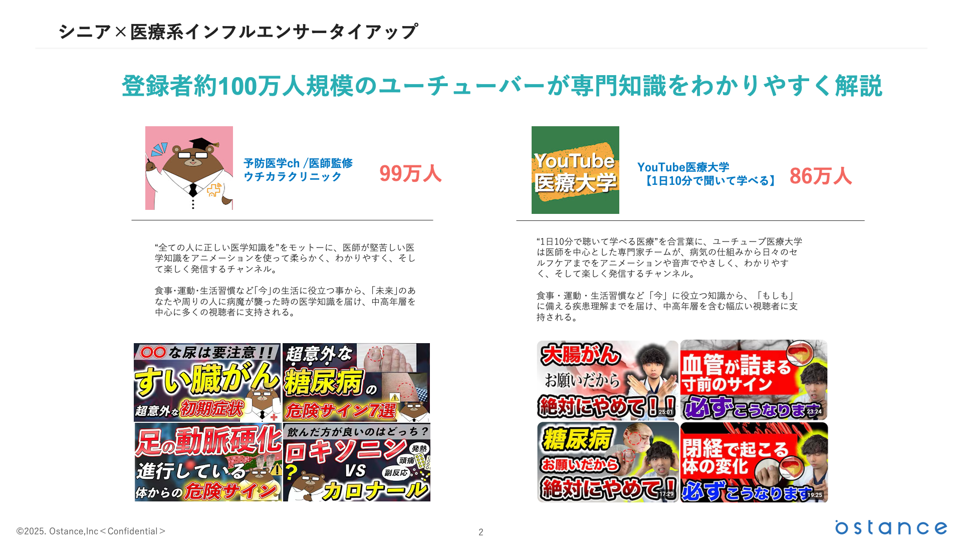 ・登録者数80〜100万人規模の医療系YouTube等と連携し、専門知識をわかりやすく解説します。