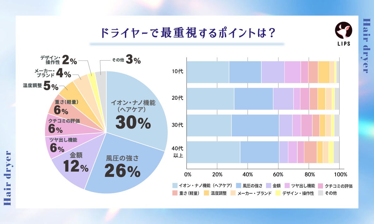 「イオン・ナノ機能(30%)」「ツヤ出し機能(6%)」の票が集まった背景について、紫外線などのダメージを受けた髪をきれいに見せたいというニーズの高まりが推察されます。