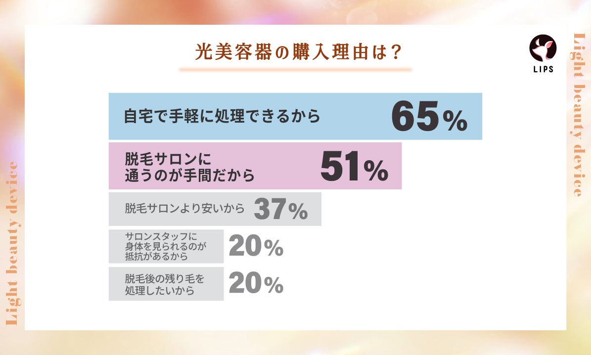 光美容器を使っているという約4割のユーザーの光美容器の購入理由として、「自宅で手間に処理できるから」「脱毛サロンに通うのが手間だから」という選択肢に票が集まりました。