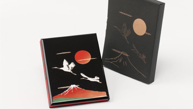 高級感のある黒漆に、鶴と富士の蒔絵と金箔を施した縁起の良い絵柄の箱型うるし台紙です。