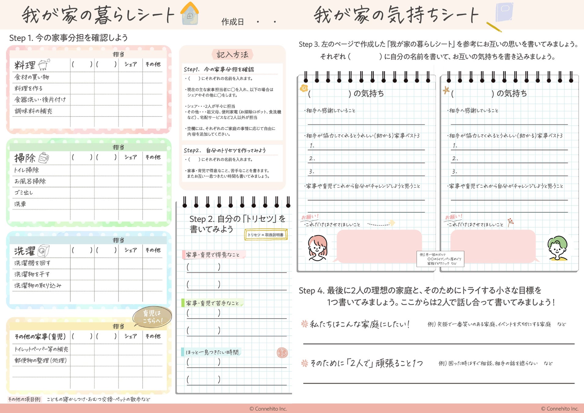 コネヒトの調査(※2)によると、家事・育児の役割分担の納得度が高いと生活満足度が高くなることがわかっています。そこで、それぞれのご夫婦にとって納得感のある家事・育児分担ができるように、話し合うための家事シェアシートを制作いたしました。