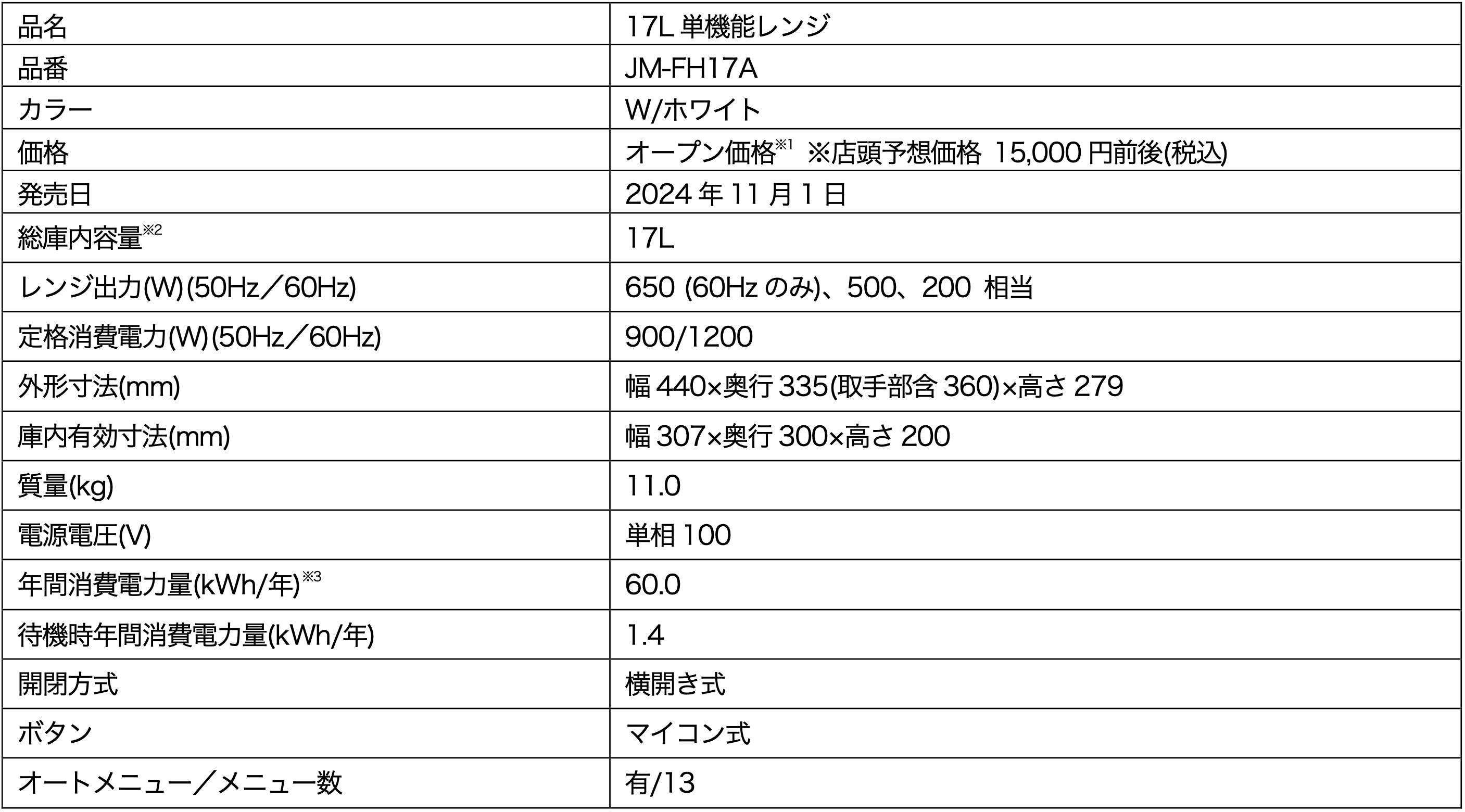 17L単機能レンジ(JM-FH17A)の概要は以下の通りです。