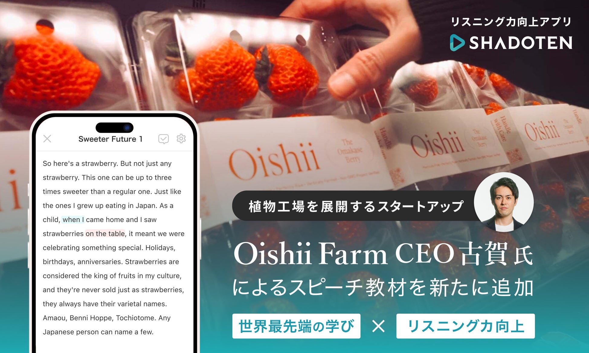 リスニング力向上アプリ「シャドテン」、Oishii Farm CEO古賀氏によるスピーチ教材を新たに追加
