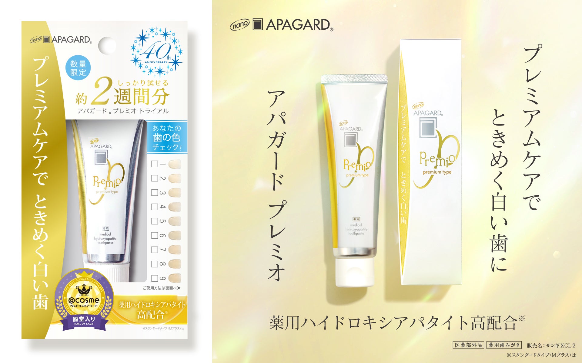 株式会社サンギ(本社:東京都中央区築地、代表取締役社長:ロズリン・ヘイマン)が展開する美白高機能歯みがき売上No.1*シリーズ「アパガード」は1985年の誕生から、今年で40周年を迎えました。2024年の美白高機能歯みがき剤*1ではトップシェアを誇るアパガード。このたび40周年を記念して、気軽にお試しいただける「アパガードプレミオトライアル」(参考価格 税込385円)を数量限定で発売いたします。2025年4月18日(金)より順次出荷を開始し、全国のドラッグストア、バラエティショップ等で販売いたします。