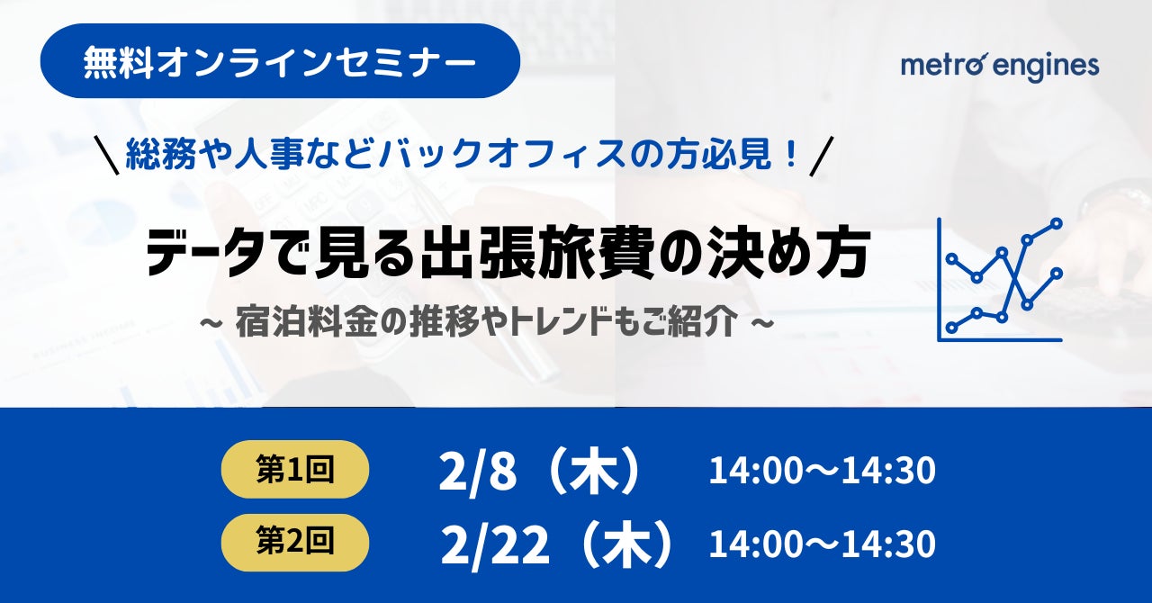 宿泊事業者を中心にダイナミックプライシングシステムを展開し、DXの推進や集客支援を行うメトロエンジン株式会社(本社:東京都品川区、代表取締役CEO:田中良介、以下メトロエンジン)が、2024年2月8日(木)と2月22日(木)の2日程でセミナーを開催し、各エリアの宿泊費の推移やトレンドから、出張旅費の見直し方法や決め方をご紹介します。