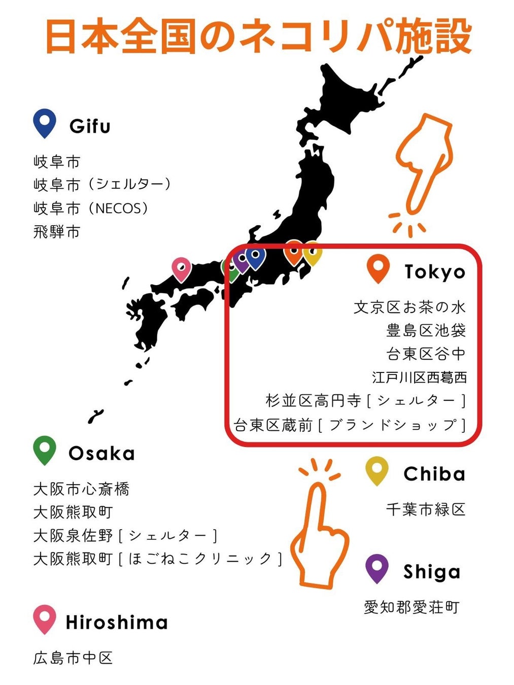 ネコリパブリックは現在日本全国に17個の拠点。東京には、保護猫カフェが4店舗、保護猫スペースが1拠点、ネコアパレルブランドショップが1店舗、そして、非営利のシェルター「ネコリパハウス高円寺」があります。
