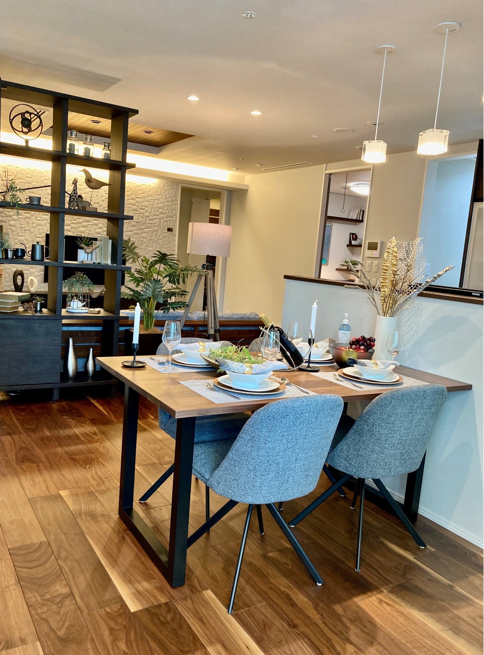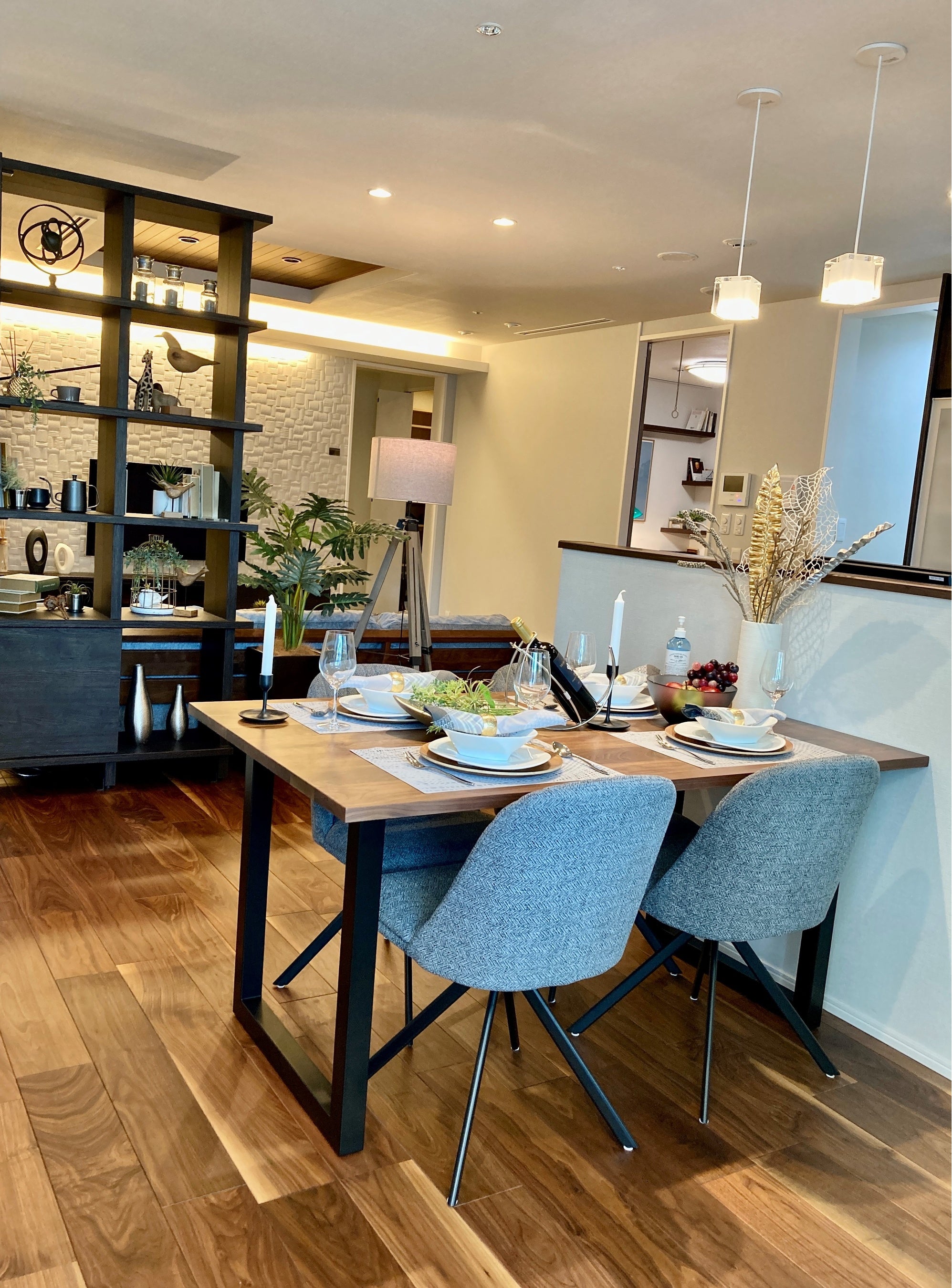 また、ダイニングテーブルにはオーク素材の伸長式の4人掛けテーブルを採用。来客時には最大8名の着座が可能となり、家具を通じて限られた空間を最大限に活かせるヒントをご提案しております。