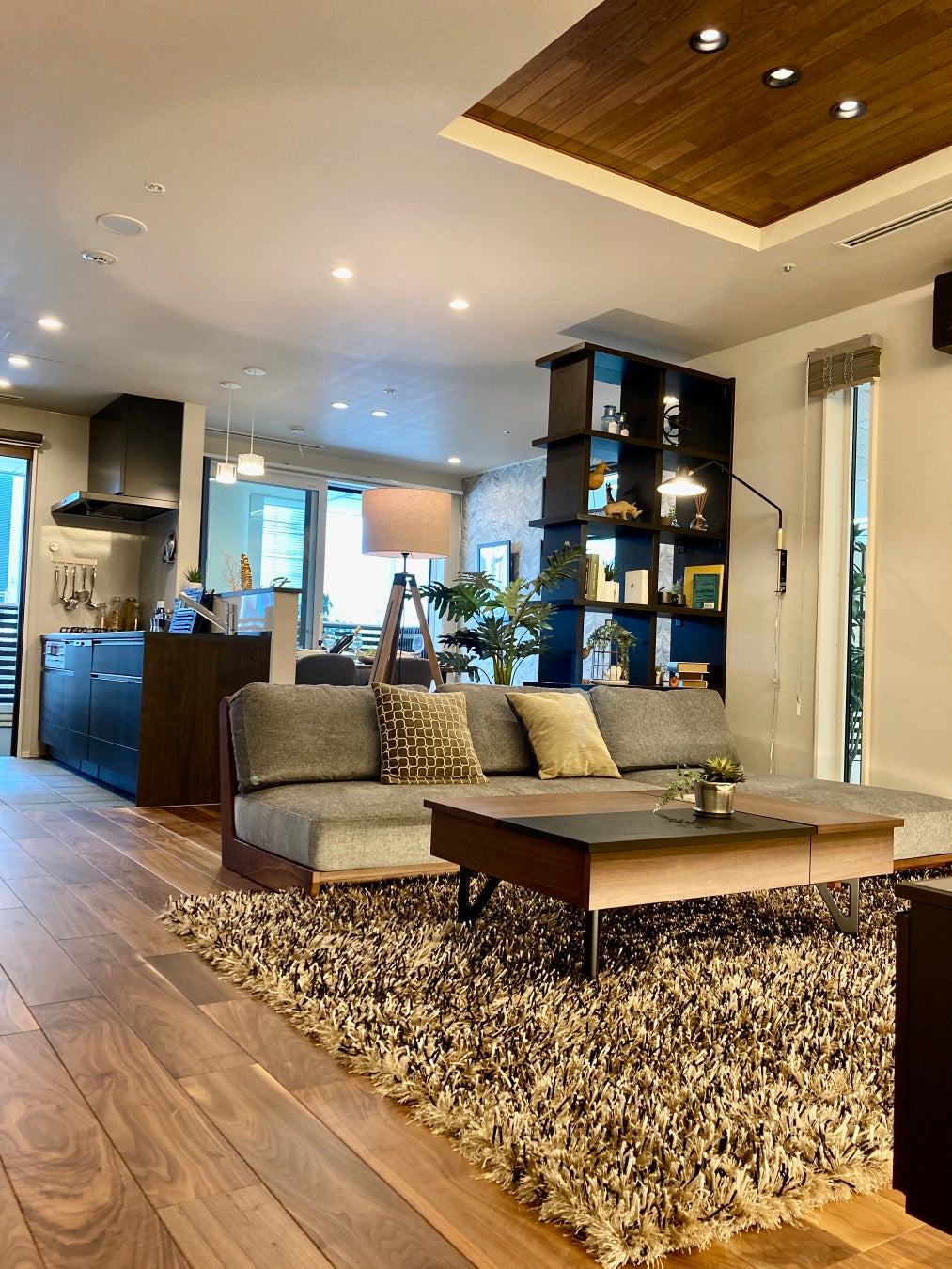 ルーム②のウォルナット素材を用いた上質な空間では、「Low & Relax」がコンセプトのローソファを採用。座面が通常より低いため、お部屋がすっきり広く見えるだけでなく、ソファに座りながら脚を伸ばしたり、ソファの上で胡坐をかくなど「Relax」ができる機能も持ち合わせています。
