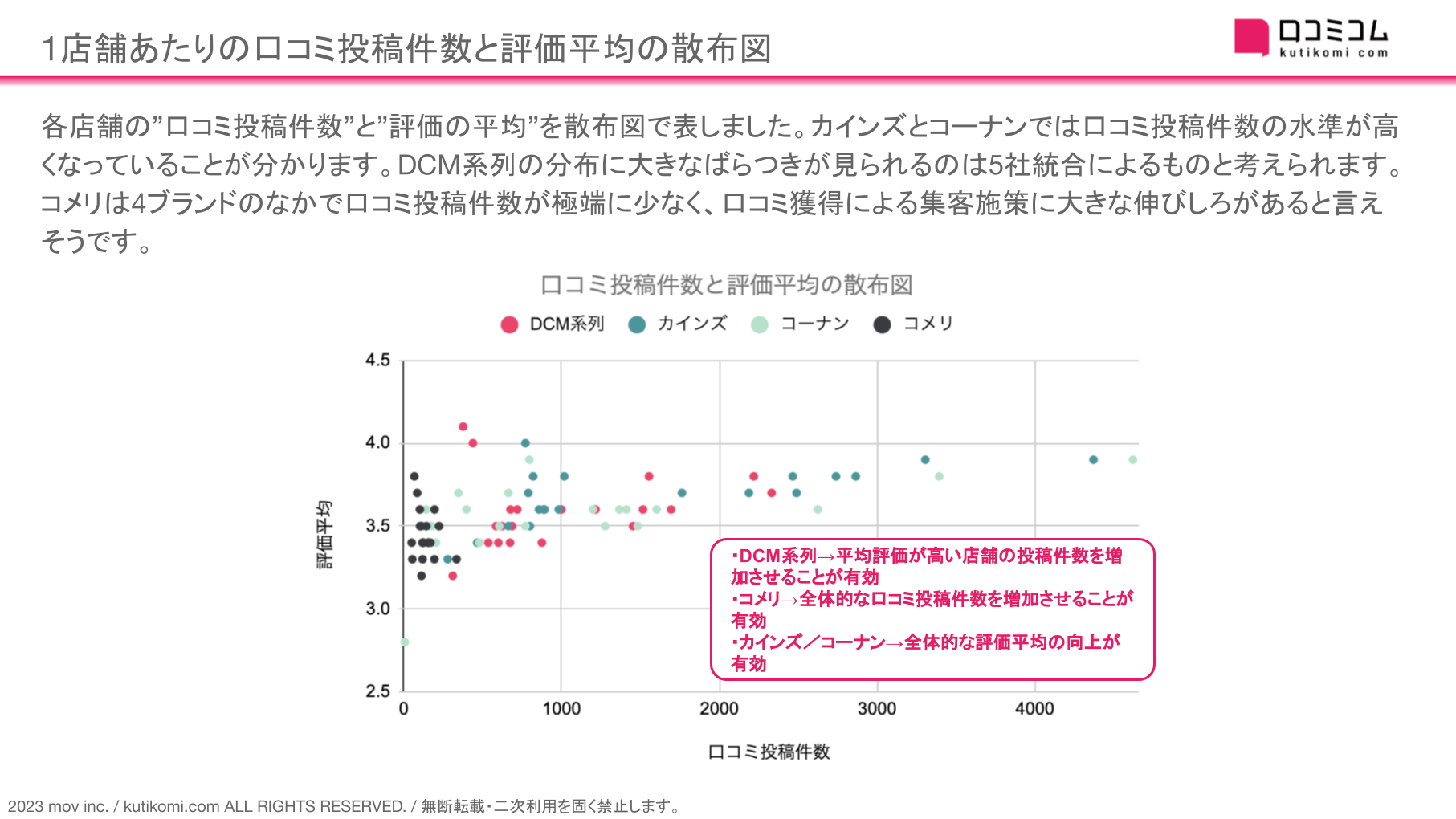 ・大手4ブランド間で“口コミ投稿件数”と“口コミ平均評価”に大きな差があること