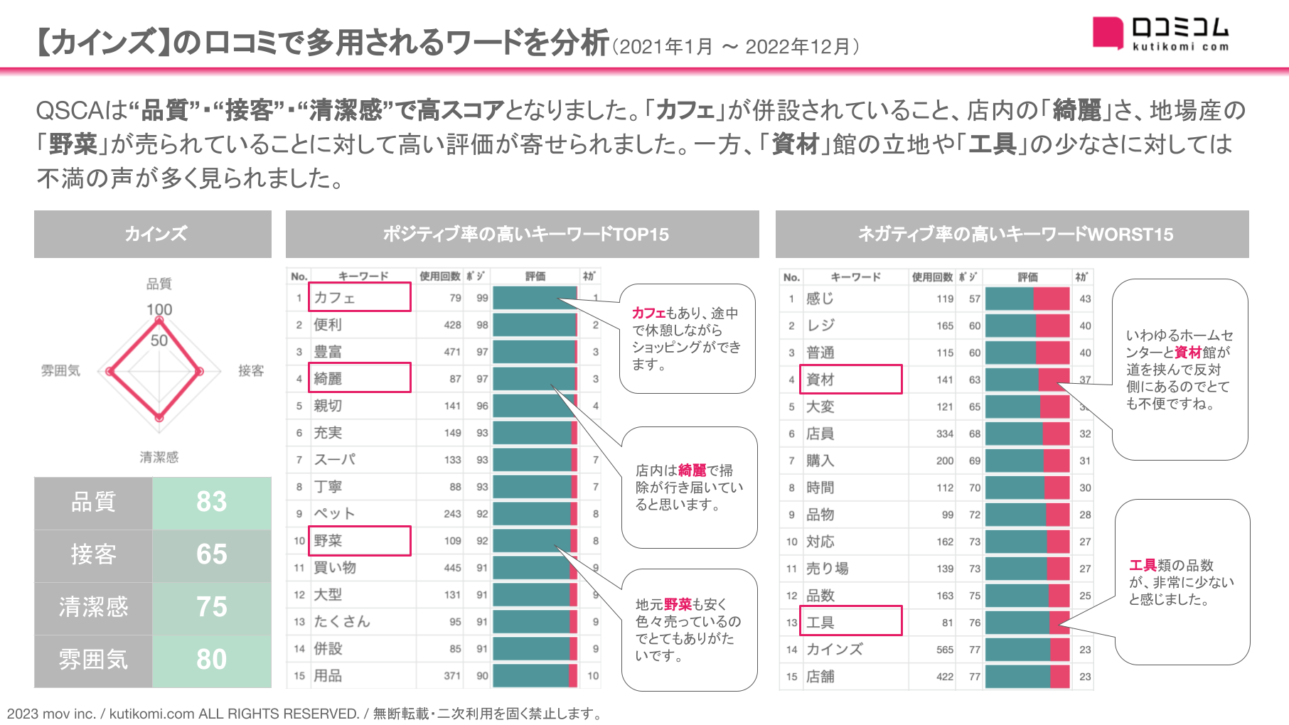 今回は、このAI解析を用いて【カインズ】のQSCA・ポジ / ネガキーワードを確認しました。