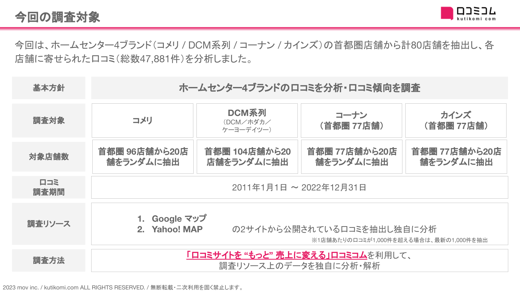 今回は、ホームセンター大手4ブランド(コメリ/DCM系列/コーナン/カインズ)に寄せられた約48,000件の口コミを調査し、4ブランドの比較検証を行いました。