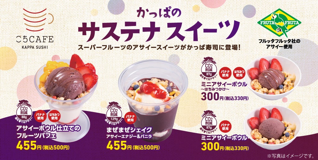 この度、株式会社フルッタフルッタ(所在地:東京都千代田区 社長:長澤誠 以下「当社」)の濃厚なアサイーを使用した「アサイースイーツ」4品が、コロワイドグループが運営するかっぱ寿司(カッパ・クリエイト㈱ 本社:神奈川県横浜市、代表取締役社長:山角豪)にて2024年11月7日(木)~12月4日(水)の期間限定でかっぱ寿司全店にて販売されますことをお知らせいたします。