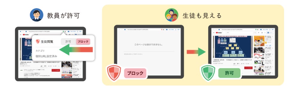 教員が授業中、アプリからその場で児童・生徒のWebページ閲覧許可を変更できます