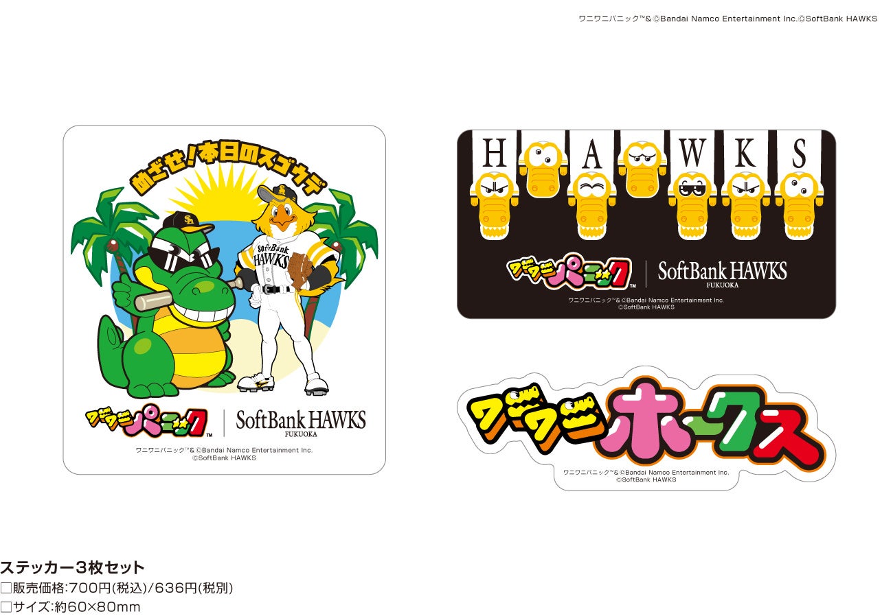 今回のコラボレーションでは、ワニワニパニックの「ワニ」と、ホークスの球団マスコット「ハリーホーク」が「めざせ!本日のスゴウデ」の台詞と並ぶデザインや、攻めてくる表情豊かな7匹のワニのデザイン、コラボロゴデザインの豪華3種のビジュアルで展開致します。