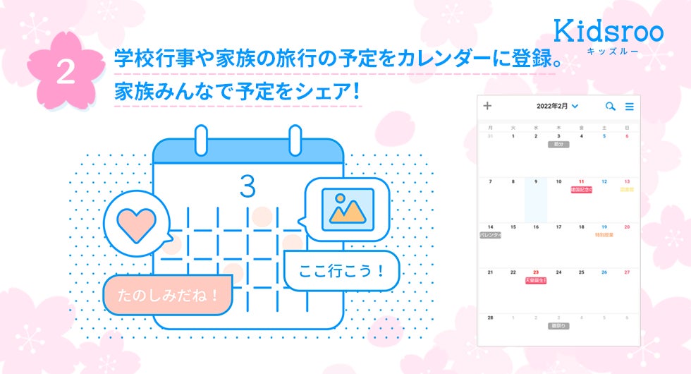 Kidsrooアプリには家族同士で予定を共有しあえるカレンダー機能があります。子供の学校の予定や家族で計画した旅行の予定などプライベートなスケジュールを家族だけで共有しあえます。