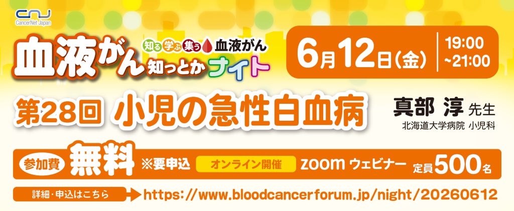 認定NPO法人キャンサーネットジャパン(東京都文京区 理事長 岩瀨 哲)は、2023年より毎月1回、血液がんに関するオンラインセミナー「血液がん知っとかナイト」を実施しています。28回目の開催となる2026年6月は「小児の急性白血病」をテーマに開催する運びとなりました。本セミナーはレモネードスタンド開催による寄付の一部を活用して開催させていただきます。
