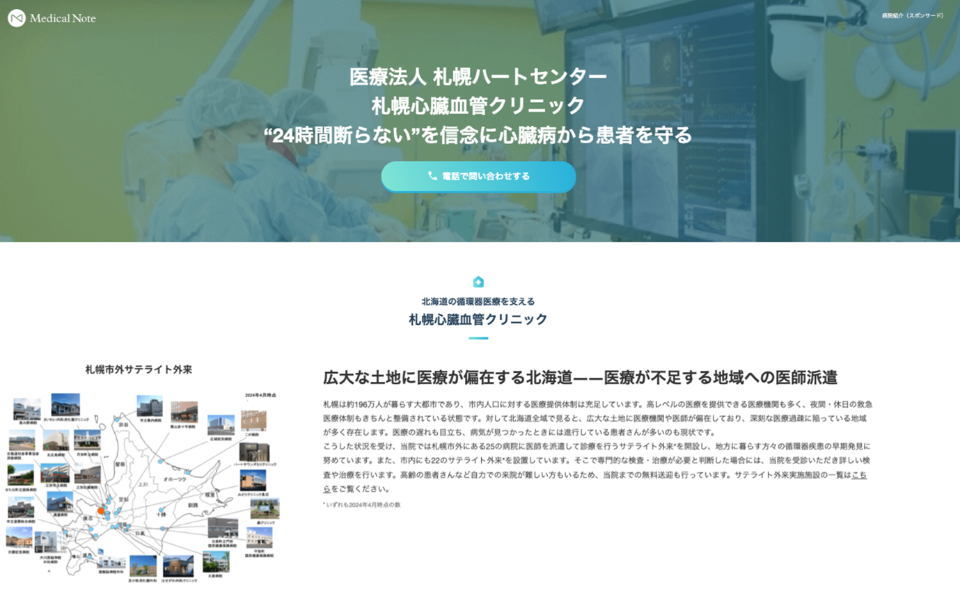 この度、循環器診療に関する情報を求める北海道の患者さんに向けて、札幌心臓血管クリニックの病院情報を適切に届けるべく、メディカルノート内において特集サイトの掲載を開始いたしました。