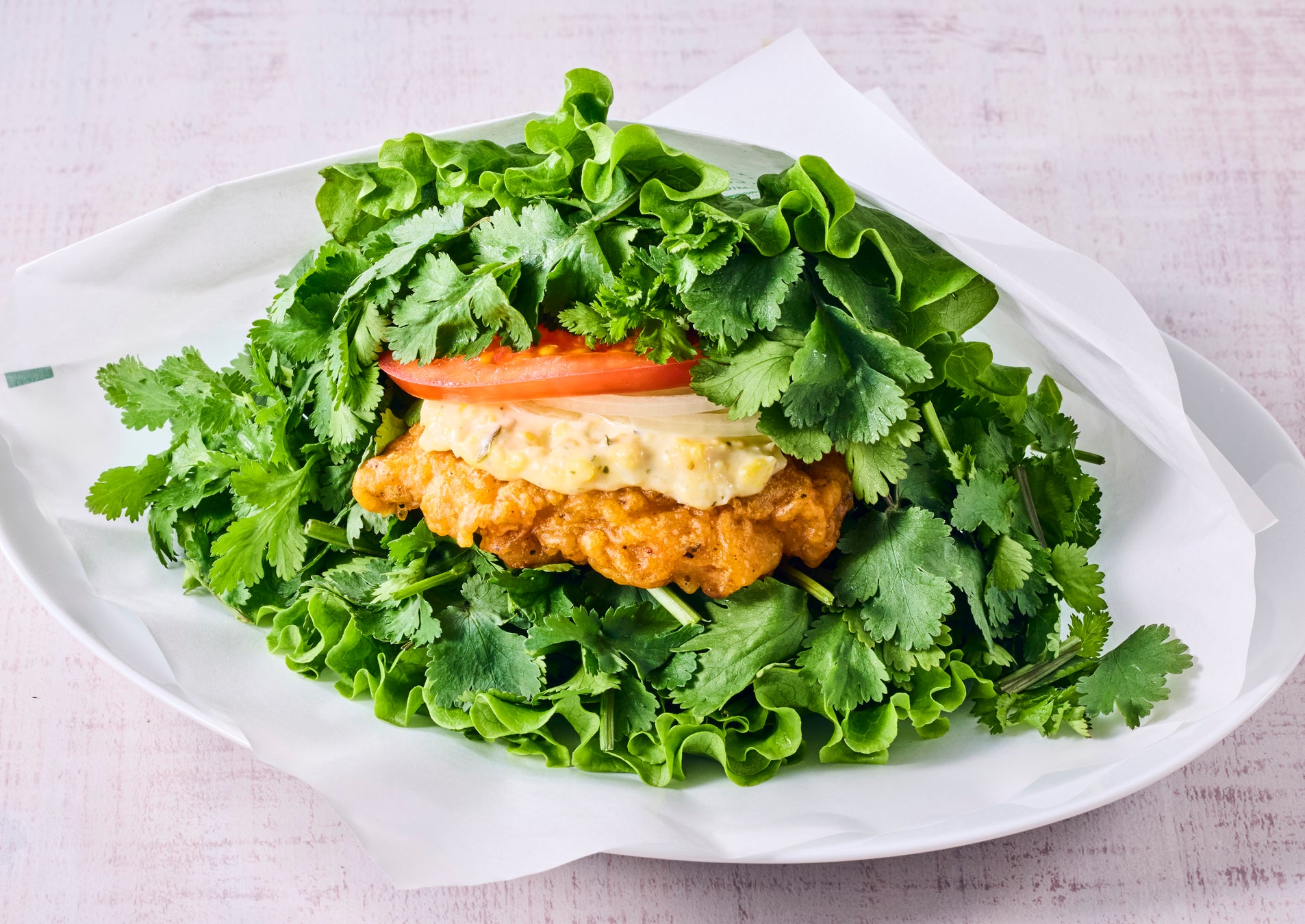 バンズを使用せず、グリーンリーフでどっさりパクチーとフライドチキン・国産生野菜をサンドし、卵をたっぷりと使いクリーミーでコクのある自家製タルタルソース、お好みで別添の塩レモンソースをかけながら召し上がりいただけます。フォークで食べても、かぶりついて食べても良し!サラダ感覚で思う存分パクチーをご堪能ください。