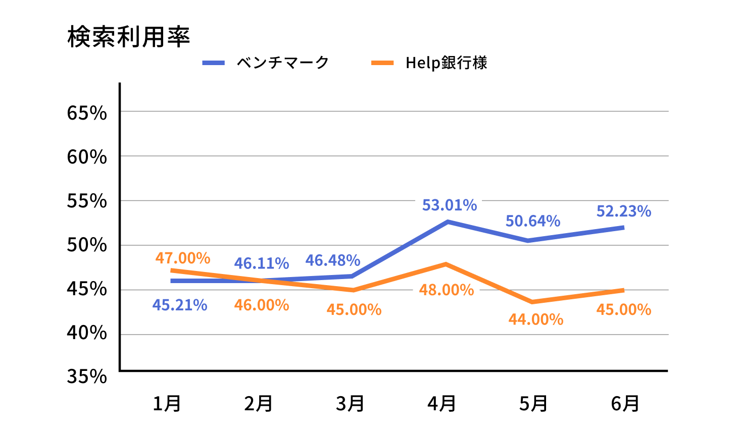 「Helpfeel」は、FAQページヘのアクセス状況、検索利用率、検索ヒット率、離脱割合等の指標を分析する伴走支援サービスを提供しています。当プラットフォームに参画いただいた地方銀行様は、これらの指標について参加銀行間の平均値が確認できます。これにより、他行と比較した場合の現状の把握や課題の抽出、課題解決に向けた優先順位付けが可能になります。さらに、運用後はベンチマークの数値を利用したレポートをご提供し、課題に対して他行のベストプラクティスを知ることで効果的に数値の改善施策を実行いただけます。