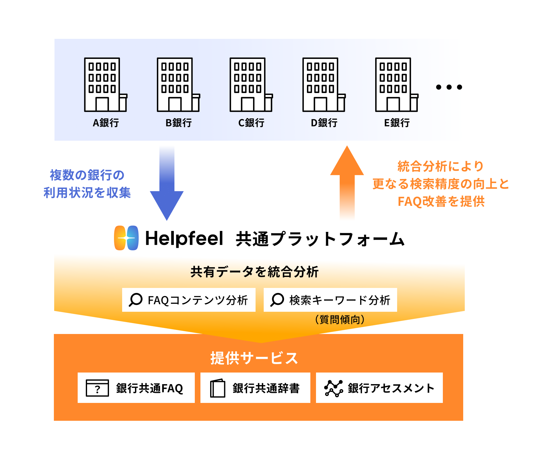 当社はこれらを業界全体の課題と捉え、同じような悩みを抱える地方銀行様に対して質の高いFAQシステムの構築を迅速に提供できるソリューションが必要と考え、「地方銀行向けHelpfeel共通プラットフォーム」を設立いたしました。このプラットフォームは、参加いただく地方銀行間で、FAQに関するデータや地方銀行用にチューニングされたFAQコンテンツを共有できる環境を構築するものです。
