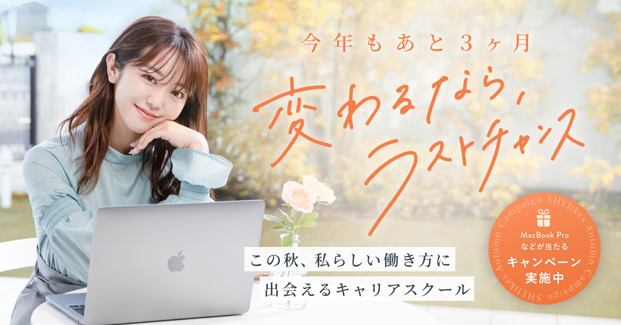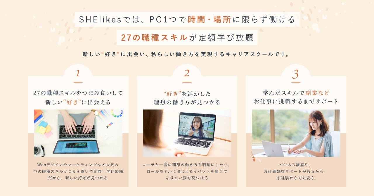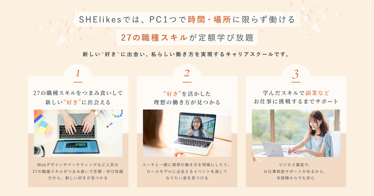 SHElikesは、Webデザイン・Webマーケティング・ライティングなどPC一つで働ける14の職種を幅広く学び、今の時代に求められるマルチクリエイターを育成して、時間や場所に縛られない賢く私らしい働き方を実現するためのキャリアスクールコミュニティです。