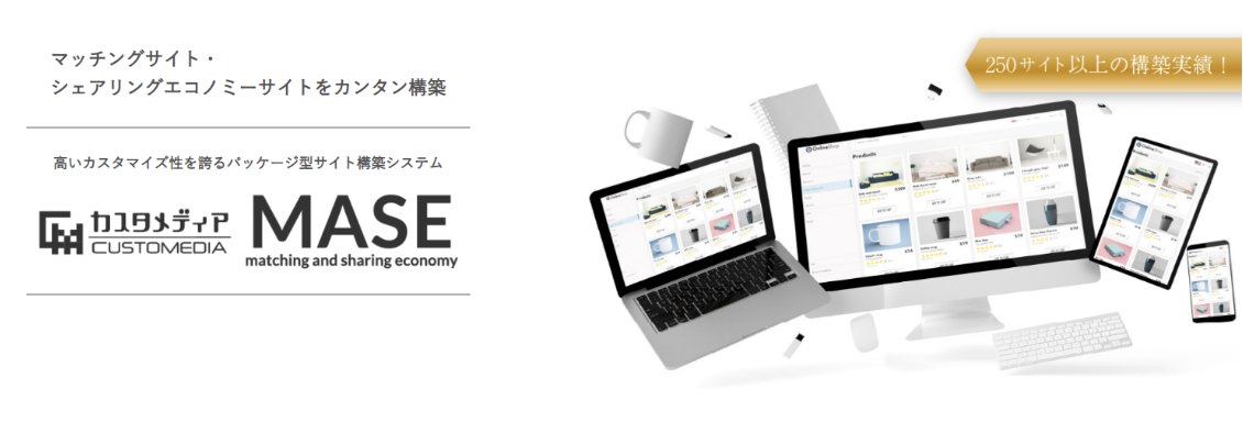 その後、スキル・モノ・スペース・金・時間を繋ぐシェアリングサービスやマッチングプラットフォームが簡単に構築できる「カスタメディアMASE」をリリース。新規創業や新規事業をご検討のお客様に向けて、各種WEBマーケティング、オフラインでの集客、プレスリリース、メディア取材などのPR支援、マネタイズの相談、法律面の相談、補助金/助成金やクラウドファンディングの財務面での支援をしています。