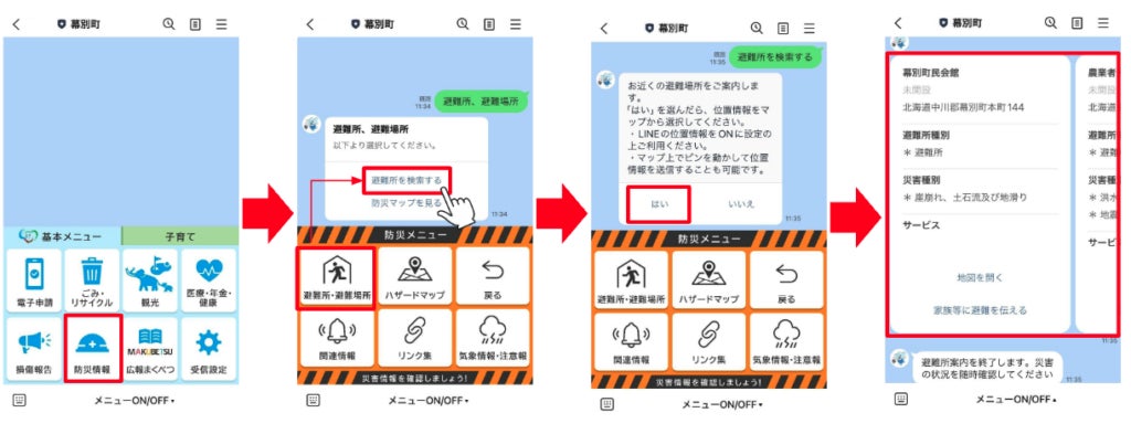 基本メニューの「防災情報」→「避難所・避難場所」→「避難所を検索する」から起動することができます。