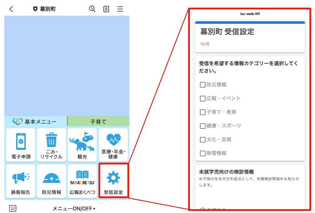 住民の希望に応じた配信だけを届ける「セグメント配信」機能を導入。欲しい配信カテゴリーを「受信設定」に回答することでカスタマイズすることができます。住民がほしい情報に絞って配信ができるため、町からの情報発信がこれまで以上に効果的になることが期待されます。