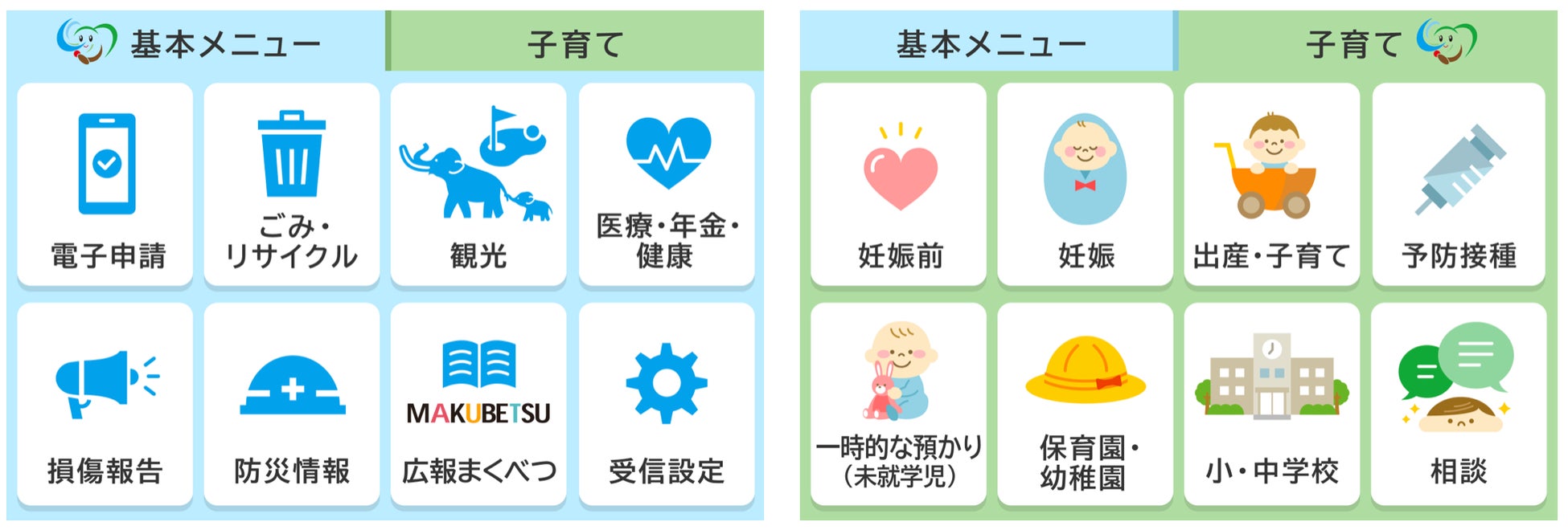 画面下部に固定されている「基本メニュー」「子育て」の2つのリッチメニューからチャットボットを起動させ、各種情報が掲載されているWebサイトに遷移することができます。従来はホームページを検索し、該当ページにアクセスすることで得ることができた情報ですが、今後はLINEのトーク画面から手軽に情報源にたどり着くことができます。