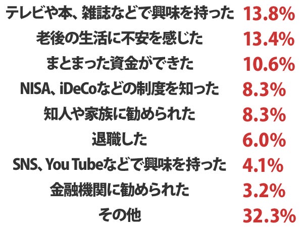 その結果、「テレビや本、雑誌などで興味を持った」と答えた投資家が13.8%と、得票率が最も高くなりました。次いで「老後の生活に不安を感じた」との回答が13.4%あったほか、「まとまった資金ができた」が10.6%、「NISA、iDeCoなどの制度を知った」と「知人や家族に勧められた」が8.3%となりました。