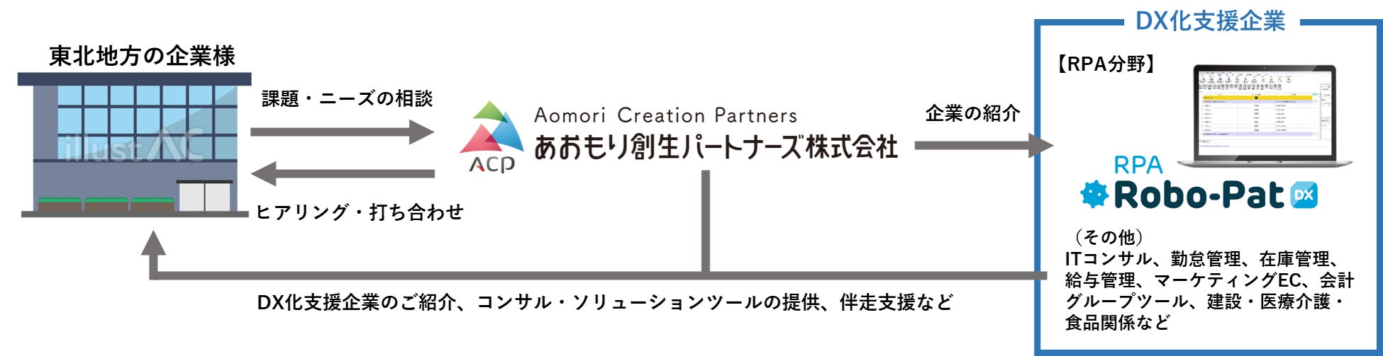 RPA「ロボパットDX」はその支援ネットワークの1社として、RPA(Robotic Process Automation)分野による業務の自動化、またRPAを活用したDX人材育成を通して東北地方の皆様の業務効率化を担います。